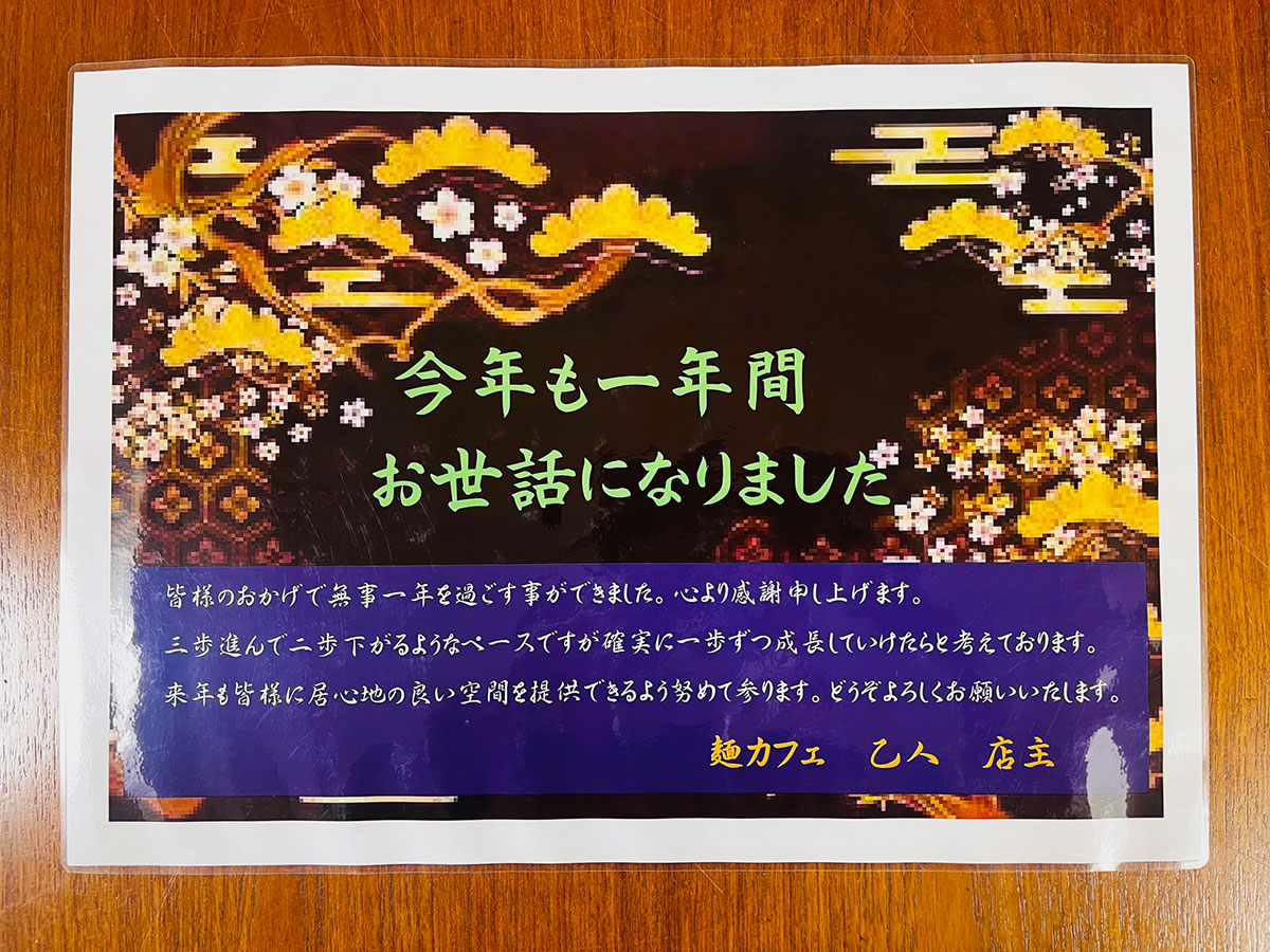 いつも麺カフェ乙人をご利用いただき、ありがとうございます。
